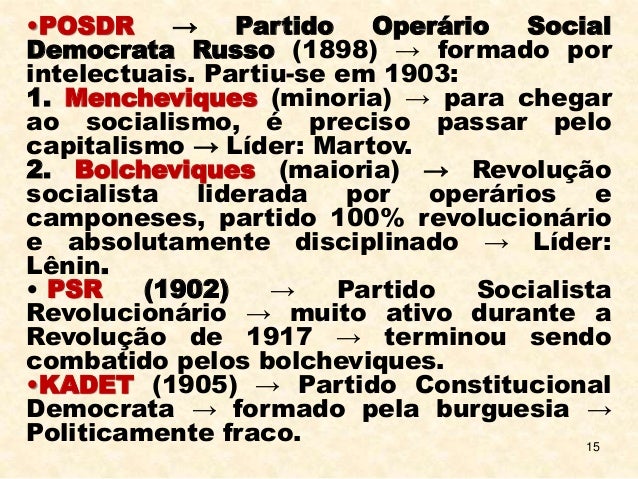 15. 15. 15 •POSDR → Partido Operário Social Democrata Russo (1898) → formado por intelectuais. Partiu-se em 1903: 1. Mencheviques (minoria) → para chegar ao socialismo, é preciso passar pelo capitalismo → Líder: Martov. 2. Bolcheviques (maioria) → Revolução socialista liderada por operários e camponeses, partido 100% revolucionário e absolutamente disciplinado → Líder: Lênin. • PSR (1902) → Partido Socialista Revolucionário → muito ativo durante a Revolução de 1917 → terminou sendo combatido pelos bolcheviques. •KADET (1905) → Partido Constitucional Democrata → formado pela burguesia → Politicamente fraco.