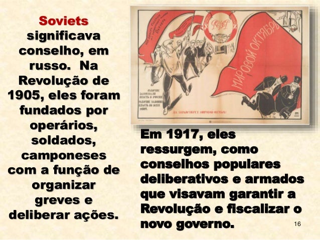16. 16. 16 Soviets significava conselho, em russo. Na Revolução de 1905, eles foram fundados por operários, soldados, camponeses com a função de organizar greves e deliberar ações. Em 1917, eles ressurgem, como conselhos populares deliberativos e armados que visavam garantir a Revolução e fiscalizar o novo governo.