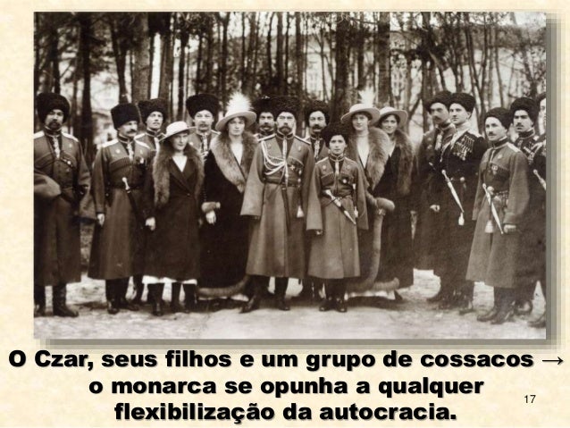 17. 17. 17 O Czar, seus filhos e um grupo de cossacos → o monarca se opunha a qualquer flexibilização da autocracia.