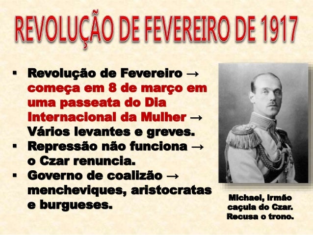 19. 19.  Revolução de Fevereiro → começa em 8 de março em uma passeata do Dia Internacional da Mulher → Vários levantes e greves.  Repressão não funciona → o Czar renuncia.  Governo de coalizão → mencheviques, aristocratas e burgueses. Michael, irmão caçula do Czar. Recusa o trono.