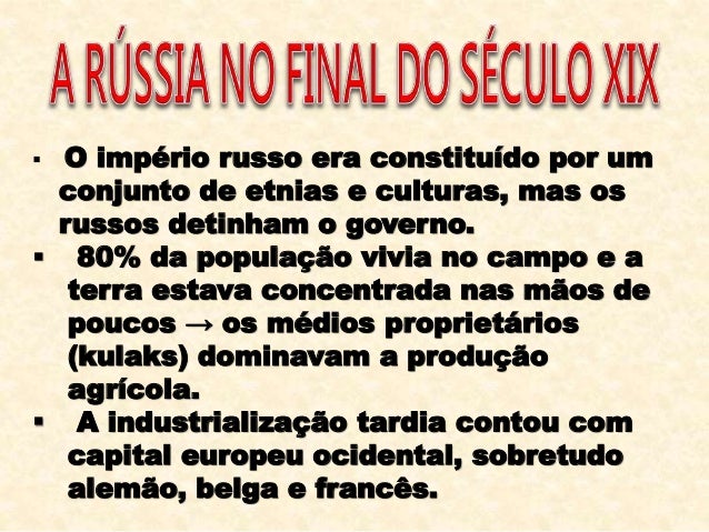 2. 2.  O império russo era constituído por um conjunto de etnias e culturas, mas os russos detinham o governo.  80% da população vivia no campo e a terra estava concentrada nas mãos de poucos → os médios proprietários (kulaks) dominavam a produção agrícola.  A industrialização tardia contou com capital europeu ocidental, sobretudo alemão, belga e francês.