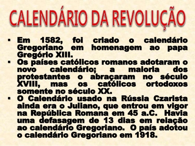 20. 20.  Em 1582, foi criado o calendário Gregoriano em homenagem ao papa Gregório XIII.  Os países católicos romanos adotaram o novo calendário; a maioria dos protestantes o abraçaram no século XVIII, mas os católicos ortodoxos somente no século XX.  O Calendário usado na Rússia Czarista ainda era o Juliano, que entrou em vigor na República Romana em 45 a.C. Havia uma defasagem de 13 dias em relação ao calendário Gregoriano. O país adotou o calendário Gregoriano em 1918.