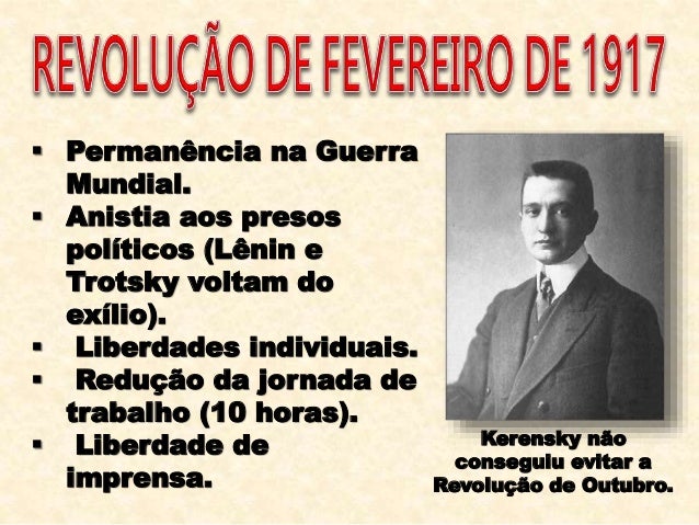 21. 21.  Permanência na Guerra Mundial.  Anistia aos presos políticos (Lênin e Trotsky voltam do exílio).  Liberdades individuais.  Redução da jornada de trabalho (10 horas).  Liberdade de imprensa. Kerensky não conseguiu evitar a Revolução de Outubro.