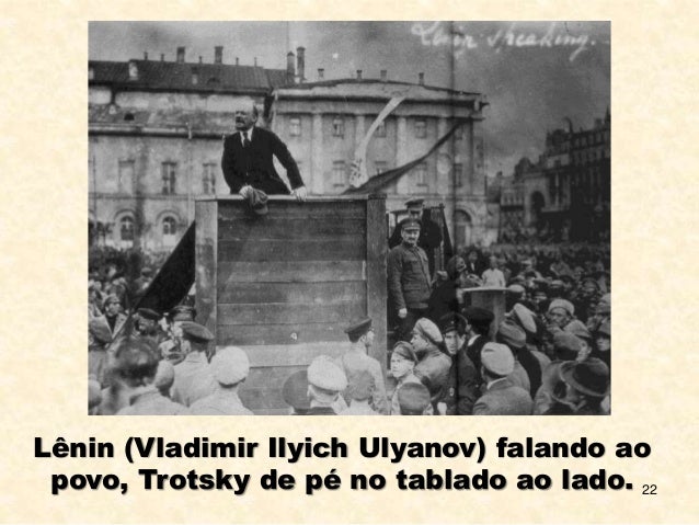 22. 22. 22 Lênin (Vladimir Ilyich Ulyanov) falando ao povo, Trotsky de pé no tablado ao lado.