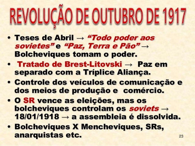 23. 23. 23 • Teses de Abril → “Todo poder aos sovietes” e “Paz, Terra e Pão” → Bolcheviques tomam o poder. • Tratado de Brest-Litovski → Paz em separado com a Tríplice Aliança. • Controle dos veículos de comunicação e dos meios de produção e comércio. • O SR vence as eleições, mas os bolcheviques controlam os soviets → 18/01/1918 → a assembleia é dissolvida. • Bolcheviques X Mencheviques, SRs, anarquistas etc.