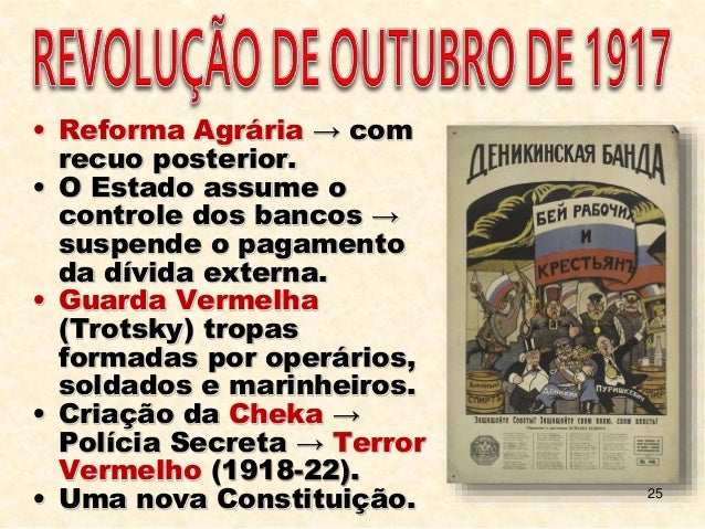 25. 25. 25 • Reforma Agrária → com recuo posterior. • O Estado assume o controle dos bancos → suspende o pagamento da dívida externa. • Guarda Vermelha (Trotsky) tropas formadas por operários, soldados e marinheiros. • Criação da Cheka → Polícia Secreta → Terror Vermelho (1918-22). • Uma nova Constituição.