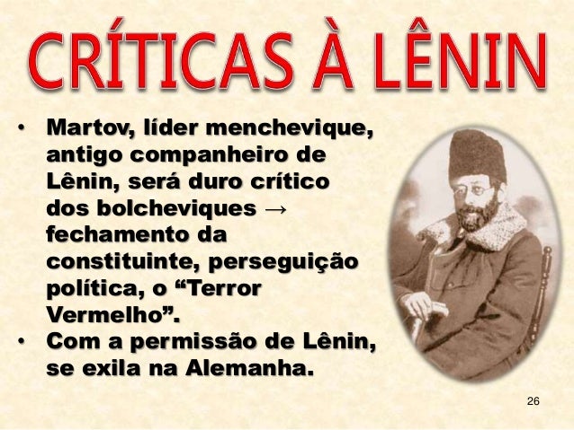 26. 26. 26 • Martov, líder menchevique, antigo companheiro de Lênin, será duro crítico dos bolcheviques → fechamento da constituinte, perseguição política, o “Terror Vermelho”. • Com a permissão de Lênin, se exila na Alemanha.