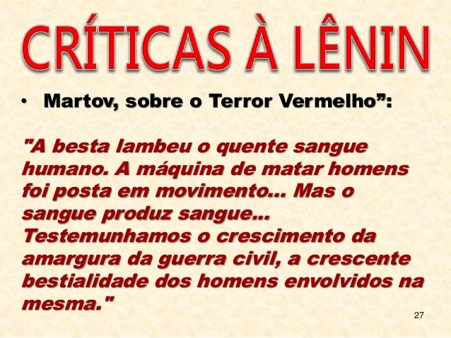 27. 27. 27 • Martov, sobre o Terror Vermelho”: "A besta lambeu o quente sangue humano. A máquina de matar homens foi posta em movimento... Mas o sangue produz sangue... Testemunhamos o crescimento da amargura da guerra civil, a crescente bestialidade dos homens envolvidos na mesma."