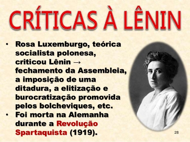 28. 28. 28 • Rosa Luxemburgo, teórica socialista polonesa, criticou Lênin → fechamento da Assembleia, a imposição de uma ditadura, a elitização e burocratização promovida pelos bolcheviques, etc. • Foi morta na Alemanha durante a Revolução Spartaquista (1919).