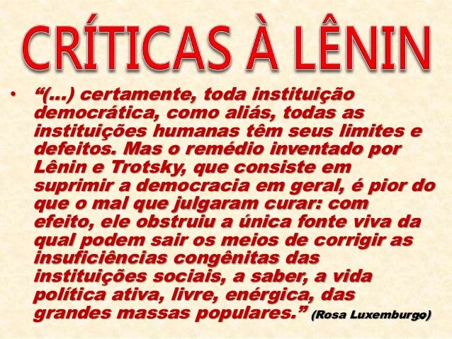29. 29. 29 • “(…) certamente, toda instituição democrática, como aliás, todas as instituições humanas têm seus limites e defeitos. Mas o remédio inventado por Lênin e Trotsky, que consiste em suprimir a democracia em geral, é pior do que o mal que julgaram curar: com efeito, ele obstruiu a única fonte viva da qual podem sair os meios de corrigir as insuficiências congênitas das instituições sociais, a saber, a vida política ativa, livre, enérgica, das grandes massas populares.” (Rosa Luxemburgo)