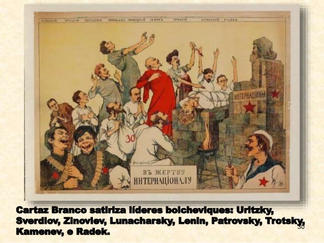 30. 30. 30 Cartaz Branco satiriza líderes bolcheviques: Uritzky, Sverdlov, Zinoviev, Lunacharsky, Lenin, Patrovsky, Trotsky, Kamenev, e Radek.