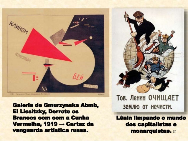 31. 31. 31 Galeria de Gmurzynska Abmb, El Lissitzky, Derrote os Brancos com com a Cunha Vermelha, 1919 → Cartaz da vanguarda artística russa. Lênin limpando o mundo dos capitalistas e monarquistas.