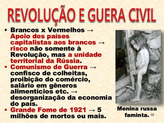 32. 32. 32 • Brancos x Vermelhos → Apoio dos países capitalistas aos brancos → risco não somente à Revolução, mas a unidade territorial da Rússia. • Comunismo de Guerra → confisco de colheitas, proibição do comércio, salário em gêneros alimentícios etc. → desorganização da economia do país. • Grande Fome de 1921 → 5 milhões de mortos ou mais. Menina russa faminta.