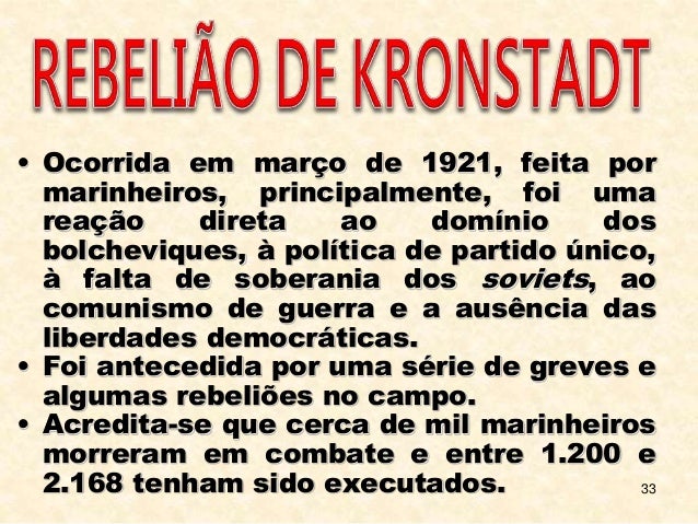 33. 33. 33 • Ocorrida em março de 1921, feita por marinheiros, principalmente, foi uma reação direta ao domínio dos bolcheviques, à política de partido único, à falta de soberania dos soviets, ao comunismo de guerra e a ausência das liberdades democráticas. • Foi antecedida por uma série de greves e algumas rebeliões no campo. • Acredita-se que cerca de mil marinheiros morreram em combate e entre 1.200 e 2.168 tenham sido executados.