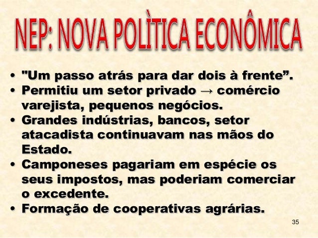 35. 35. 35 • "Um passo atrás para dar dois à frente”. • Permitiu um setor privado → comércio varejista, pequenos negócios. • Grandes indústrias, bancos, setor atacadista continuavam nas mãos do Estado. • Camponeses pagariam em espécie os seus impostos, mas poderiam comerciar o excedente. • Formação de cooperativas agrárias.