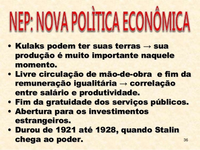 36. 36. 36 • Kulaks podem ter suas terras → sua produção é muito importante naquele momento. • Livre circulação de mão-de-obra e fim da remuneração igualitária → correlação entre salário e produtividade. • Fim da gratuidade dos serviços públicos. • Abertura para os investimentos estrangeiros. • Durou de 1921 até 1928, quando Stalin chega ao poder.
