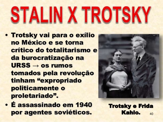 40. 40. 40 • Trotsky vai para o exílio no México e se torna crítico do totalitarismo e da burocratização na URSS → os rumos tomados pela revolução tinham “expropriado politicamente o proletariado”. • É assassinado em 1940 por agentes soviéticos. Trotsky e Frida Kahlo.