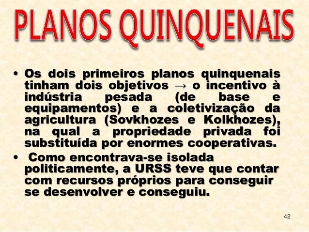 42. 42. 42 • Os dois primeiros planos quinquenais tinham dois objetivos → o incentivo à indústria pesada (de base e equipamentos) e a coletivização da agricultura (Sovkhozes e Kolkhozes), na qual a propriedade privada foi substituída por enormes cooperativas. • Como encontrava-se isolada politicamente, a URSS teve que contar com recursos próprios para conseguir se desenvolver e conseguiu.