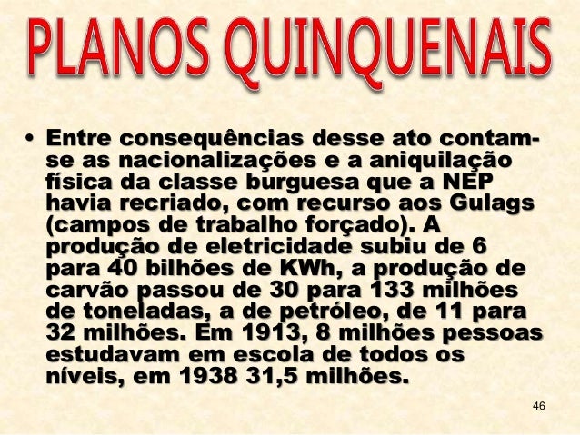 46. 46. 46 • Entre consequências desse ato contam- se as nacionalizações e a aniquilação física da classe burguesa que a NEP havia recriado, com recurso aos Gulags (campos de trabalho forçado). A produção de eletricidade subiu de 6 para 40 bilhões de KWh, a produção de carvão passou de 30 para 133 milhões de toneladas, a de petróleo, de 11 para 32 milhões. Em 1913, 8 milhões pessoas estudavam em escola de todos os níveis, em 1938 31,5 milhões.