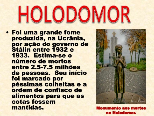47. 47. 47 • Foi uma grande fome produzida, na Ucrânia, por ação do governo de Stálin entre 1932 e 1933. Estima-se o número de mortos entre 2.5-7.5 milhões de pessoas. Seu início foi marcado por péssimas colheitas e a ordem de confisco de alimentos para que as cotas fossem mantidas. Monumento aos mortos no Holodomor.