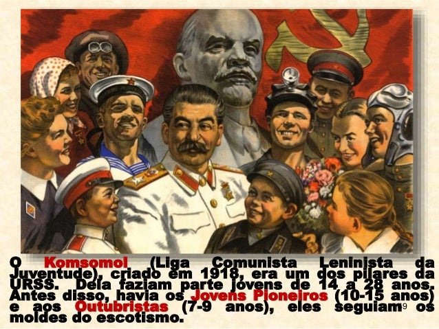 49. 49. 49 O Komsomol (Liga Comunista Leninista da Juventude), criado em 1918, era um dos pilares da URSS. Dela faziam parte jovens de 14 a 28 anos. Antes disso, havia os Jovens Pioneiros (10-15 anos) e aos Outubristas (7-9 anos), eles seguiam os moldes do escotismo.