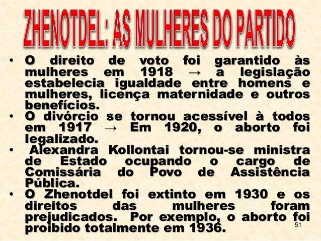 51. 51. 51 • O direito de voto foi garantido às mulheres em 1918 → a legislação estabelecia igualdade entre homens e mulheres, licença maternidade e outros benefícios. • O divórcio se tornou acessível à todos em 1917 → Em 1920, o aborto foi legalizado. • Alexandra Kollontai tornou-se ministra de Estado ocupando o cargo de Comissária do Povo de Assistência Pública. • O Zhenotdel foi extinto em 1930 e os direitos das mulheres foram prejudicados. Por exemplo, o aborto foi proibido totalmente em 1936.