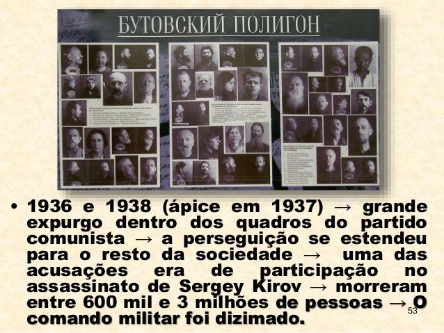 53. 53. 53 • 1936 e 1938 (ápice em 1937) → grande expurgo dentro dos quadros do partido comunista → a perseguição se estendeu para o resto da sociedade → uma das acusações era de participação no assassinato de Sergey Kirov → morreram entre 600 mil e 3 milhões de pessoas → O comando militar foi dizimado.