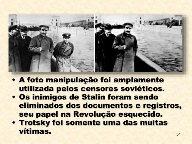 54. 54. 54 • A foto manipulação foi amplamente utilizada pelos censores soviéticos. • Os inimigos de Stalin foram sendo eliminados dos documentos e registros, seu papel na Revolução esquecido. • Trotsky foi somente uma das muitas vítimas.