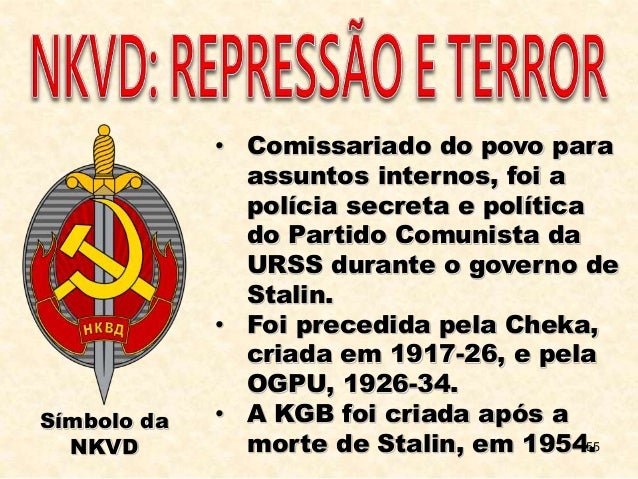 55. 55. 55 • Comissariado do povo para assuntos internos, foi a polícia secreta e política do Partido Comunista da URSS durante o governo de Stalin. • Foi precedida pela Cheka, criada em 1917-26, e pela OGPU, 1926-34. • A KGB foi criada após a morte de Stalin, em 1954. Símbolo da NKVD