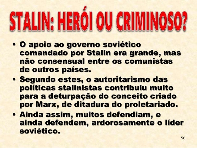 56. 56. 56 • O apoio ao governo soviético comandado por Stalin era grande, mas não consensual entre os comunistas de outros países. • Segundo estes, o autoritarismo das políticas stalinistas contribuiu muito para a deturpação do conceito criado por Marx, de ditadura do proletariado. • Ainda assim, muitos defendiam, e ainda defendem, ardorosamente o líder soviético.