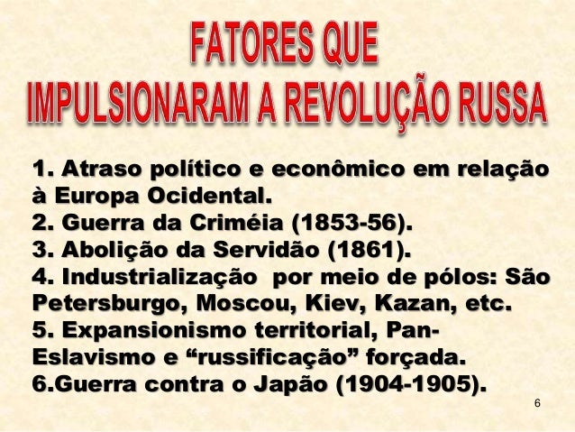 6. 6. 6 1. Atraso político e econômico em relação à Europa Ocidental. 2. Guerra da Criméia (1853-56). 3. Abolição da Servidão (1861). 4. Industrialização por meio de pólos: São Petersburgo, Moscou, Kiev, Kazan, etc. 5. Expansionismo territorial, Pan- Eslavismo e “russificação” forçada. 6.Guerra contra o Japão (1904-1905).