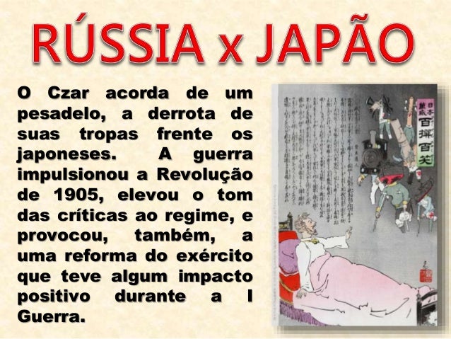 7. 7. 7 O Czar acorda de um pesadelo, a derrota de suas tropas frente os japoneses. A guerra impulsionou a Revolução de 1905, elevou o tom das críticas ao regime, e provocou, também, a uma reforma do exército que teve algum impacto positivo durante a I Guerra.