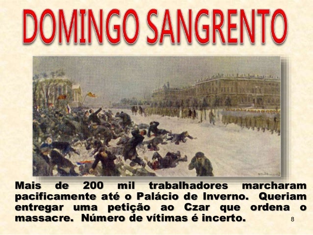 8. 8. 8 Mais de 200 mil trabalhadores marcharam pacificamente até o Palácio de Inverno. Queriam entregar uma petição ao Czar que ordena o massacre. Número de vítimas é incerto.
