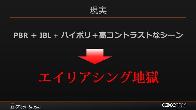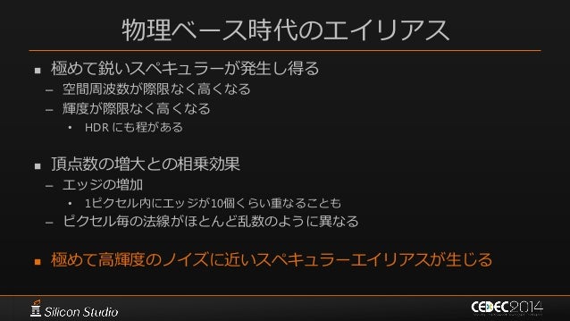 100. 100. 物理ベース時代のエイリアス  極めて鋭いスペキュラーが発生し得る – 空間周波数が際限なく高くなる – 輝度が際限なく高くなる • HDR にも程がある  頂点数の増大との相乗効果 – エッジの増加 • 1ピクセル内にエッジが10個くらい重なることも – ピクセル毎の法線がほとんど乱数のように異なる  極めて高輝度のノイズに近いスペキュラーエイリアスが生じる