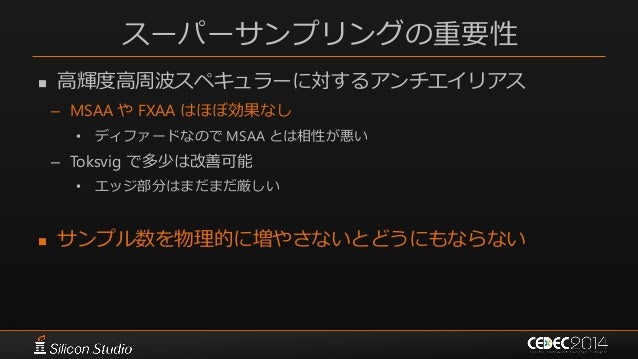 99. 99. 従来のアンチエイリアシング  ハードウェアマルチサンプリング – MSAA – カバレッジのみのスーパーサンプリング • シェーディングは1サンプルのみ • ポリゴンエッジにしか効果がない – シェーディングによって生じるエイリアスには効果なし • スペキュラーエイリアスには無力  ポストプロセス型アンチエイリアス – FXAAなど – サンプリングを増やす訳ではない – 時間方向へのエイリアシングには効果なし • 静止画としてのジャギーにしか効果がない • 一枚絵では綺麗でも動かすとウネウネする  これらは画像としてのジャギー除去に最適化した技術 – 本当にサンプリングが増えている訳ではない – 本質的な解決方法ではない
