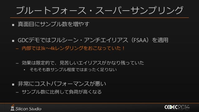 104. 104. ブルートフォース・スーパーサンプリング  真面目にサンプル数を増やす  GDCデモではフルシーン・アンチエイリアス(FSAA)を適用 – 内部では3k~4kレンダリングをおこなっていた! – 効果は限定的で、見苦しいエイリアスがかなり残っていた • そもそも数サンプル程度ではまったく足りない  非常にコストパフォーマンスが悪い – サンプル数に比例して負荷が高くなる