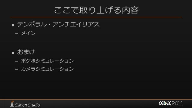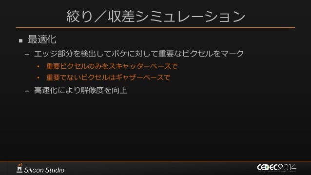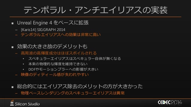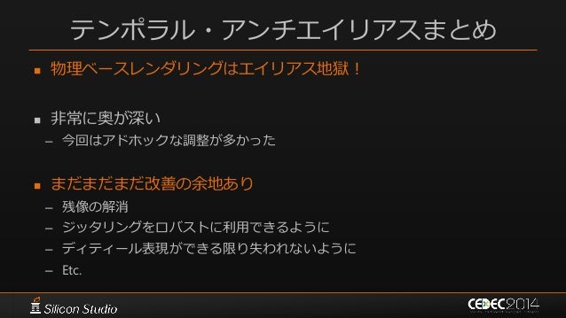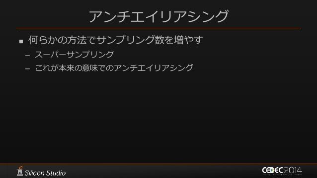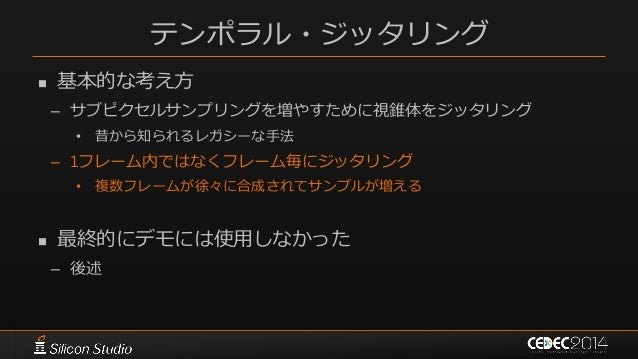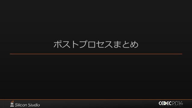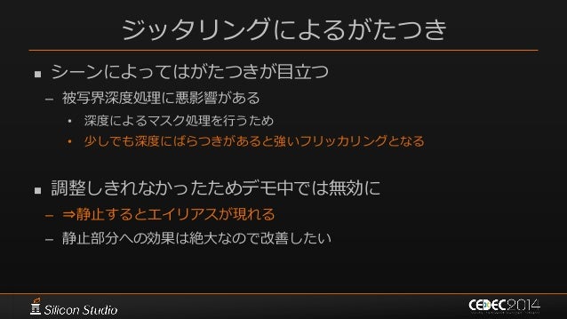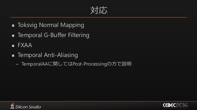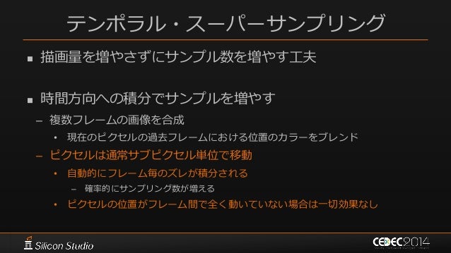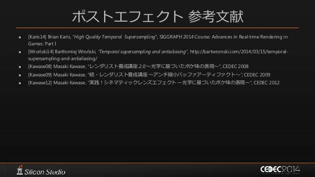 146. 146. ポストエフェクト 参考文献  [Karis14] Brian Karis, “High Quality Temporal Supersampling”, SIGGRAPH 2014 Course: Advances in Real-time Rendering in Games: Part I  [Wroński14] Bartłomiej Wroński, “Temporal supersampling and antialiasing”, http://bartwronski.com/2014/03/15/temporal- supersampling-and-antialiasing/  [Kawase08] Masaki Kawase, “レンダリスト養成講座 2.0 ~光学に基づいたボケ味の表現~”, CEDEC 2008  [Kawase09] Masaki Kawase, “続・レンダリスト養成講座 ~アンチ縮小バッファアーティファクト~”, CEDEC 2009  [Kawase12] Masaki Kawase, “実践!シネマティックレンズエフェクト ー光学に基づいたボケ味の表現ー”, CEDEC 2012