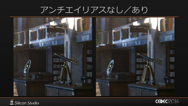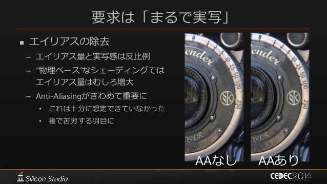 24. 24. 要求は「まるで実写」  エイリアスの除去 – エイリアス量と実写感は反比例 – “物理ベース”なシェーディングでは エイリアス量はむしろ増大 – Anti-Aliasingがきわめて重要に • これは十分に想定できていなかった • 後で苦労する羽目に AAなし AAあり