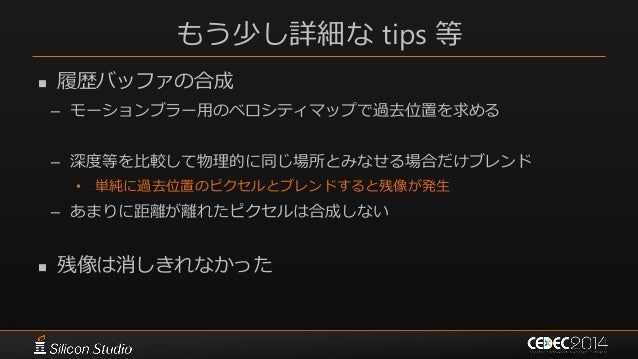 110. 110. もう少し詳細な tips 等  履歴バッファの合成 – モーションブラー用のベロシティマップで過去位置を求める – 深度等を比較して物理的に同じ場所とみなせる場合だけブレンド • 単純に過去位置のピクセルとブレンドすると残像が発生 – あまりに距離が離れたピクセルは合成しない  残像は消しきれなかった