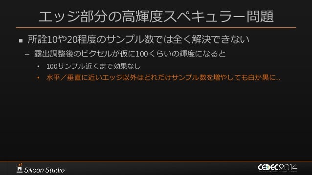 111. 111. エッジ部分の高輝度スペキュラー問題  所詮10や20程度のサンプル数では全く解決できない – 露出調整後のピクセルが仮に100くらいの輝度になると • 100サンプル近くまで効果なし • 水平/垂直に近いエッジ以外はどれだけサンプル数を増やしても白か黒に…
