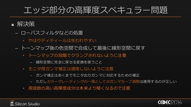 112. 112. エッジ部分の高輝度スペキュラー問題  解決策 – ローパスフィルタなどの処置 • やはりディティールは失われやすい – トーンマップ後の色空間で合成して最後に線形空間に戻す • トーンマップの段階でクランプされないように注意 – 線形空間に完全に戻せる変換を使うこと • モニタ用ガンマ補正は適用しないように注意 – ガンマ補正はあくまでモニタ出力ガンマに対応するための補正 – ただしカラーグレーディングの一環としてのガンマカーブ調整は適用するのが正しい • 周波数の高い高輝度成分は本来より暗くなるので注意
