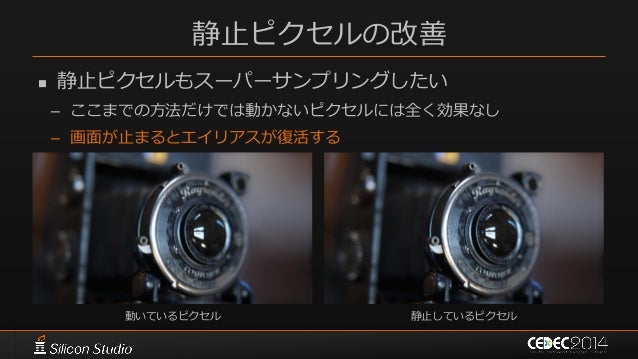 113. 113. 静止ピクセルの改善  静止ピクセルもスーパーサンプリングしたい – ここまでの方法だけでは動かないピクセルには全く効果なし – 画面が止まるとエイリアスが復活する 動いているピクセル 静止しているピクセル