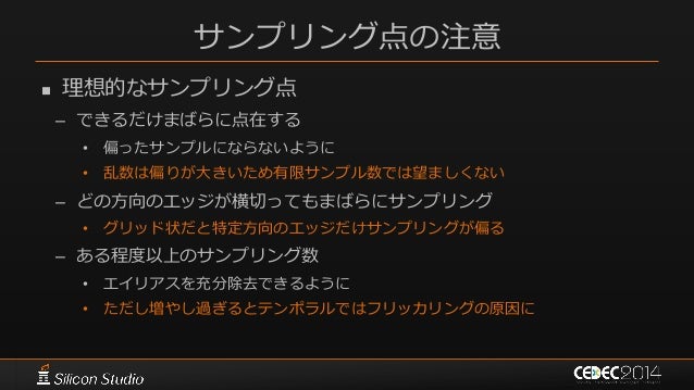 116. 116. サンプリング点の注意  理想的なサンプリング点 – できるだけまばらに点在する • 偏ったサンプルにならないように • 乱数は偏りが大きいため有限サンプル数では望ましくない – どの方向のエッジが横切ってもまばらにサンプリング • グリッド状だと特定方向のエッジだけサンプリングが偏る – ある程度以上のサンプリング数 • エイリアスを充分除去できるように • ただし増やし過ぎるとテンポラルではフリッカリングの原因に