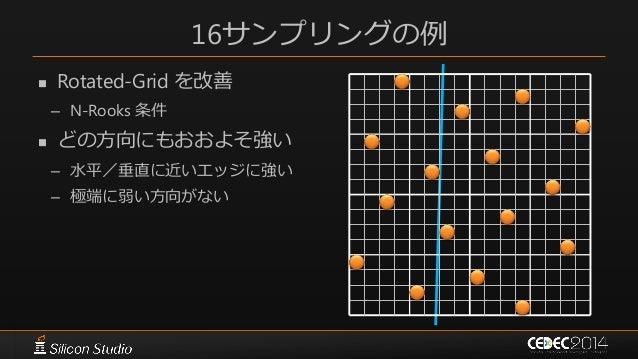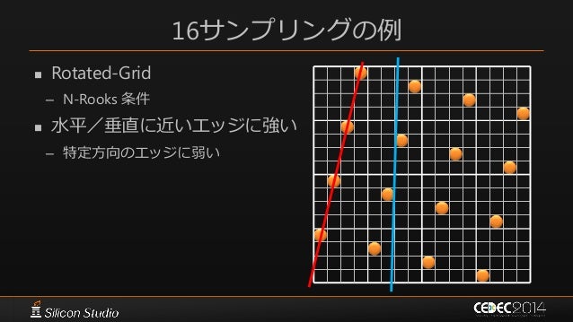 118. 118. 16サンプリングの例  Rotated-Grid – N-Rooks 条件  水平/垂直に近いエッジに強い – 特定方向のエッジに弱い