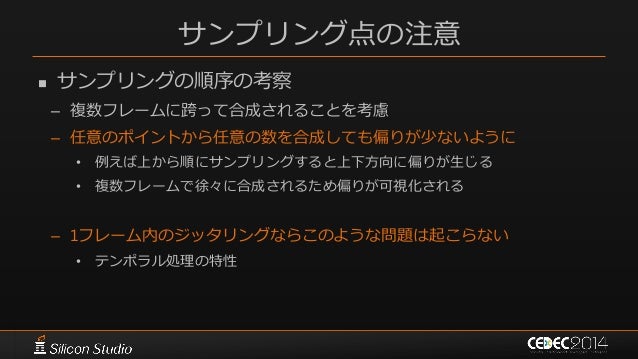 120. 120. サンプリング点の注意  サンプリングの順序の考察 – 複数フレームに跨って合成されることを考慮 – 任意のポイントから任意の数を合成しても偏りが少ないように • 例えば上から順にサンプリングすると上下方向に偏りが生じる • 複数フレームで徐々に合成されるため偏りが可視化される – 1フレーム内のジッタリングならこのような問題は起こらない • テンポラル処理の特性