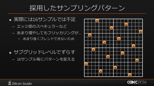121. 121. 採用したサンプリングパターン  実際には16サンプルでは不足 – エッジ部のスペキュラーなど – あまり増やしてもフリッカリングが… • あまり強くブレンドできないため  サブグリッドレベルでずらす – 16サンプル毎にパターンを変える 0 5 C 8 A F 7 4 3 1 9 D E 2 B 6