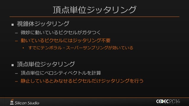 122. 122. 頂点単位ジッタリング  視錐体ジッタリング – 微妙に動いているピクセルがガタつく – 動いているピクセルにはジッタリング不要 • すでにテンポラル・スーパーサンプリングが効いている  頂点単位ジッタリング – 頂点単位にベロシティベクトルを計算 – 静止しているとみなせるピクセルだけジッタリングを行う