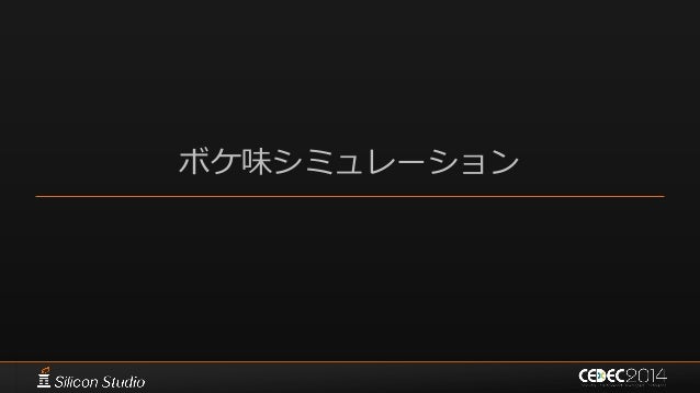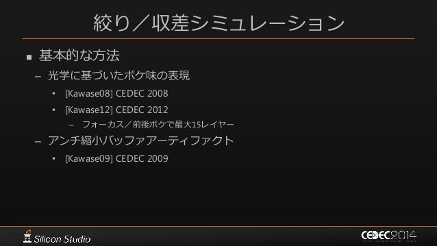 126. 126. 絞り/収差シミュレーション  基本的な方法 – 光学に基づいたボケ味の表現 • [Kawase08] CEDEC 2008 • [Kawase12] CEDEC 2012 – フォーカス/前後ボケで最大15レイヤー – アンチ縮小バッファアーティファクト • [Kawase09] CEDEC 2009