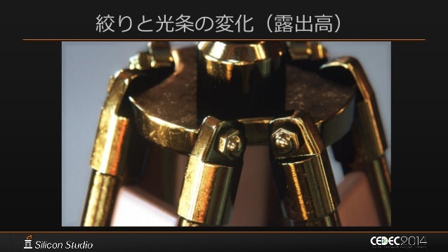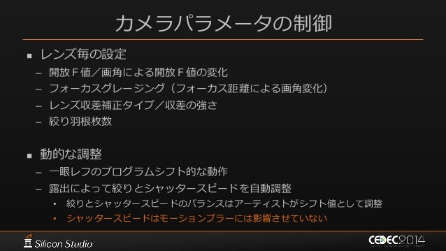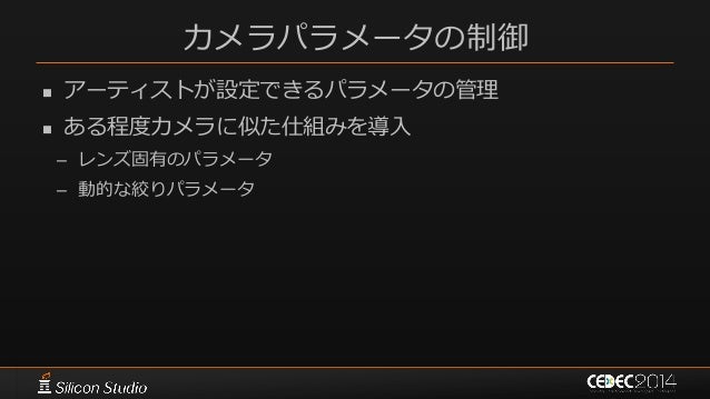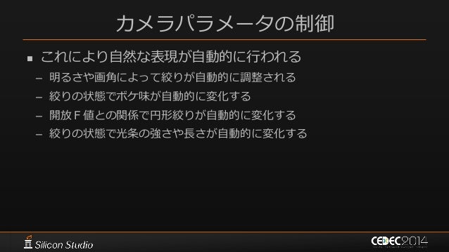 131. 131. カメラパラメータの制御  アーティストが設定できるパラメータの管理  ある程度カメラに似た仕組みを導入 – レンズ固有のパラメータ – 動的な絞りパラメータ