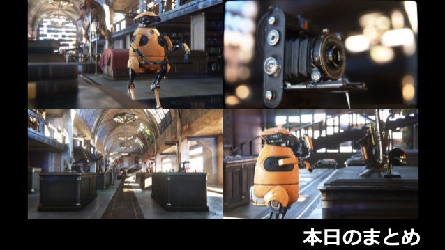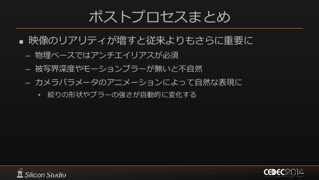 139. 139. ポストプロセスまとめ  映像のリアリティが増すと従来よりもさらに重要に – 物理ベースではアンチエイリアスが必須 – 被写界深度やモーションブラーが無いと不自然 – カメラパラメータのアニメーションによって自然な表現に • 絞りの形状やブラーの強さが自動的に変化する
